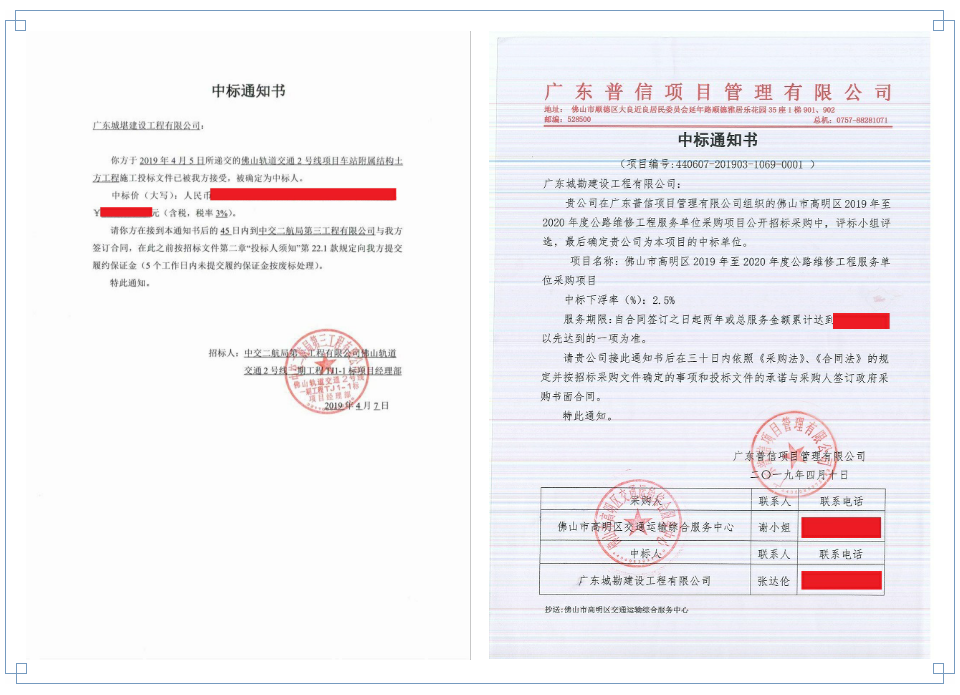 好事成双,我司旗下星空online(中国)-广东城勘建设工程有限星空online(中国),续4月5日中标“佛山轨道交通2号线项目车站附属结构土方工程”后,于4月10日再次成功中标“佛山市高明区2019-2020年度公路维修工程服务单位采购项目”。